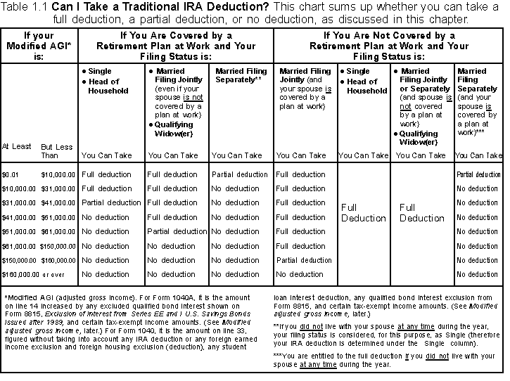 To determine if your deduction is subject to the phaseout, you must determine your modified adjusted gross income (AGI) and your filing status, as explained under Deduction Phaseout. Once you have determined your modified AGI and your filing status, you can use Table 1.1 to determine if the phaseout applies.