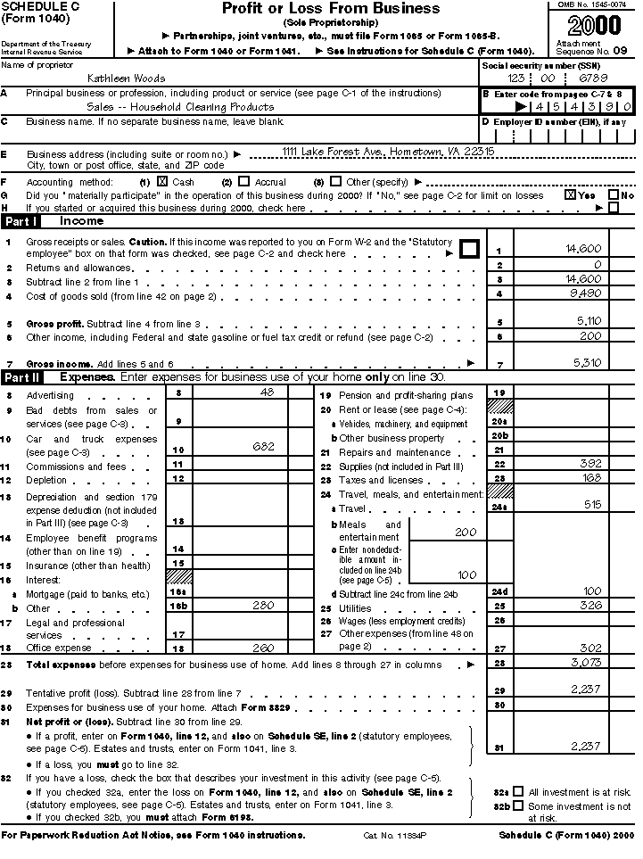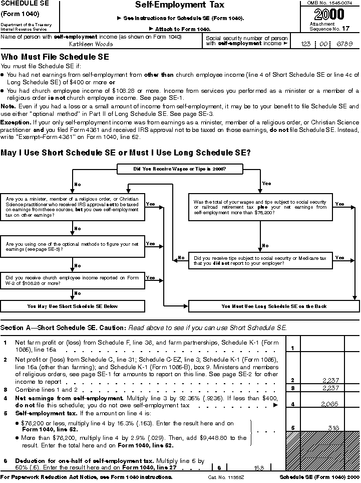 Samples of Schedule C and Schedule SE for Kathleen Woods are illustrated on the following pages. (Amounts have been rounded to the nearest dollar.)