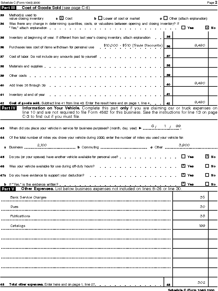 Line 4. Kathleen uses Part III to figure her cost of goods sold for the year. She has no inventory at the beginning or end of the year. Therefore, she has no entry on line 35 or line 41 of Part III. She purchased $10,000 worth of household products during 2000 for $9,490. (She received trade discounts of $510.) She enters her net cost of $9,490 ($10,000 - $510) on line 36. She also enters this amount on lines 40 and 42 of Part III and on line 4 of Part I.