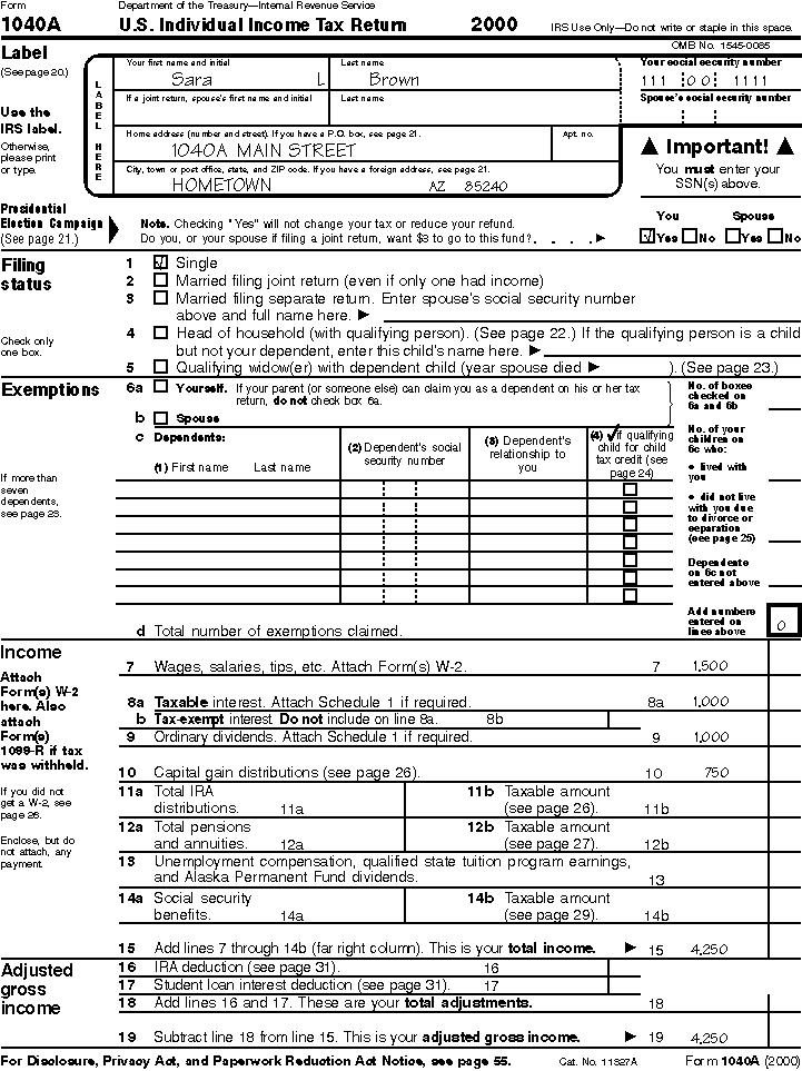 Form 1040A, page 1, for Sara L. Brown