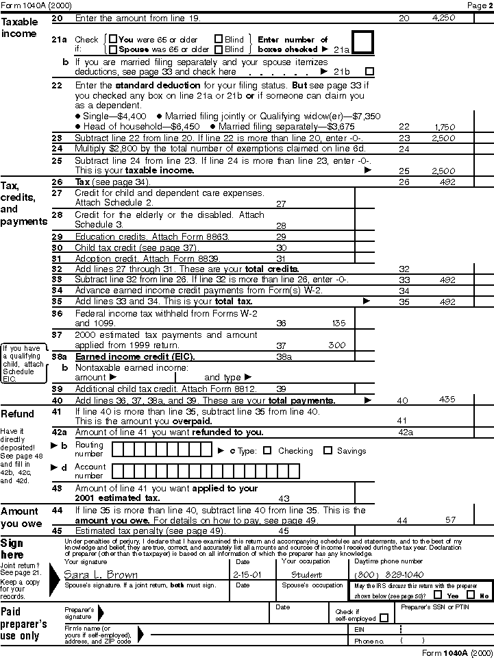 Form 1040A, page 2, for Sara L. Brown