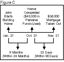 Example 2. On January 31, John began building a home on the lot that he owned. He used $45,000 of his personal funds to build the home. The home was completed on October 31. On November 21, John took out a $36,000 mortgage that was secured by the home. The mortgage can be treated as used to build the home because it was taken out within 90 days after the home was completed. The entire mortgage qualifies as home acquisition debt because it was not more than the expenses incurred within the period beginning 24 months before the home was completed. This is illustrated by Figure C.