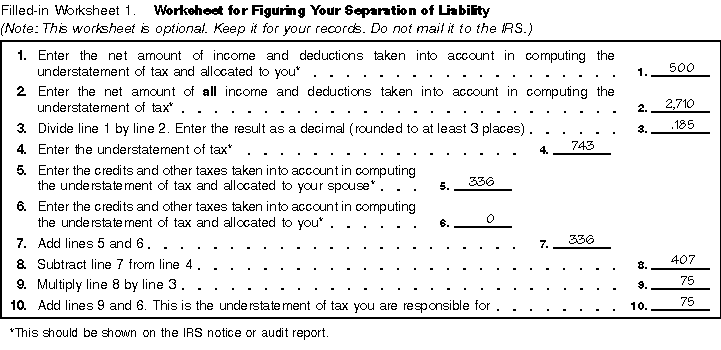 Filled-in Worksheet for Figuring Your Separation of Liability.