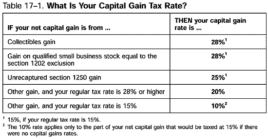 The capital gain rate may be 10%, 15%, 20%, 25%, or 28%, or a combination of those rates, as shown in Table 17-1