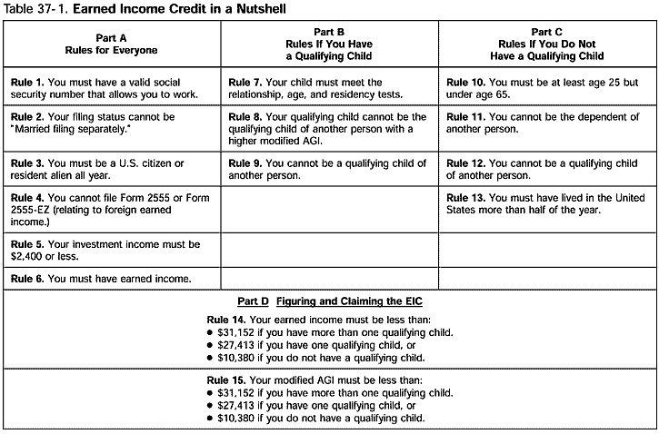 To see if you can claim the EIC, you must first meet all of the rules explained in Part A, Rules for Everyone. Then you must meet the rules in Part B, Rules If you Have a Qualifying Child, or Part C, Rules If You Do Not Have a Qualifying Child. There are two final rules you must meet in Part D, Figuring and Claiming the EIC. You qualify for the credit if you meet all the rules in each part that applies to you. For example: