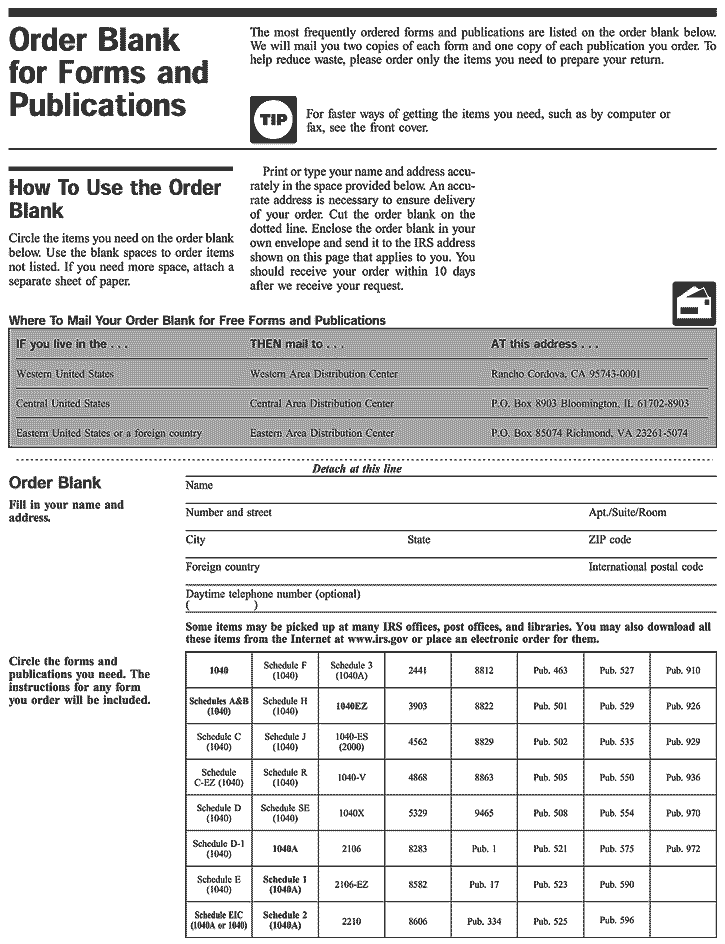 Mail. You can send your order for forms, instructions, and publications to the Distribution Center nearest to you and receive a response within 10 workdays after your request is received. Find the address that applies to your part of the country.