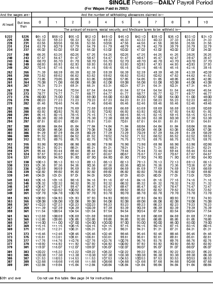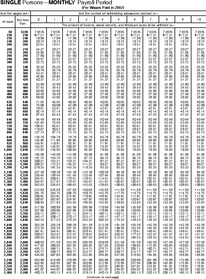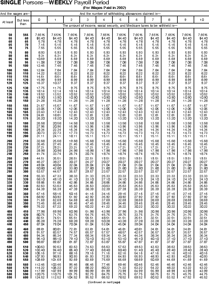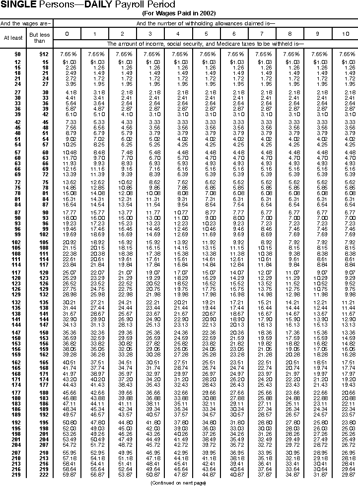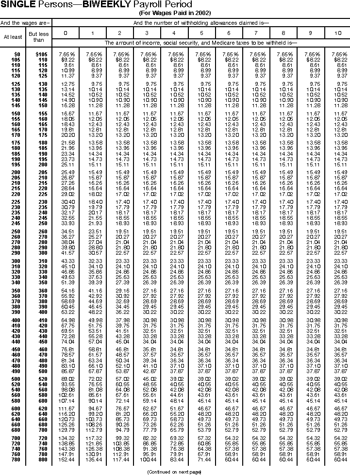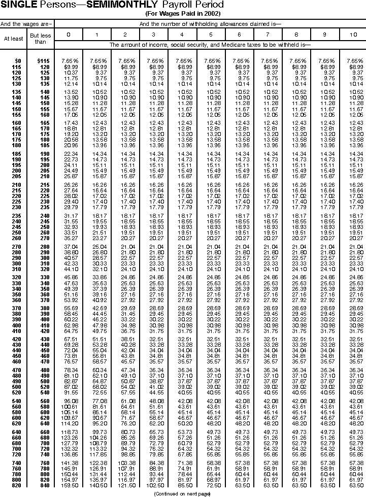 The combined tables give the correct total withholding only if wages for social security and Medicare taxes and income tax withholding are the same. When you have paid more than the maximum amount of wages subject to social security tax ($84,900 in 2002) in a calendar year, you may no longer use the combined tables.