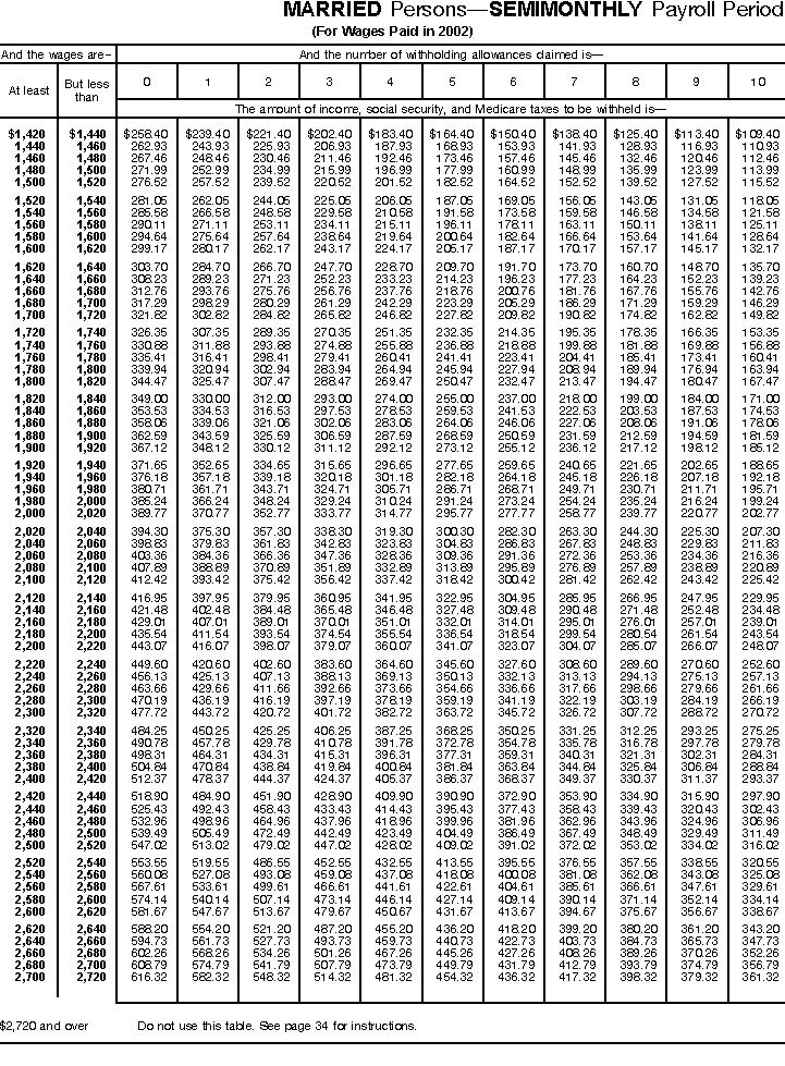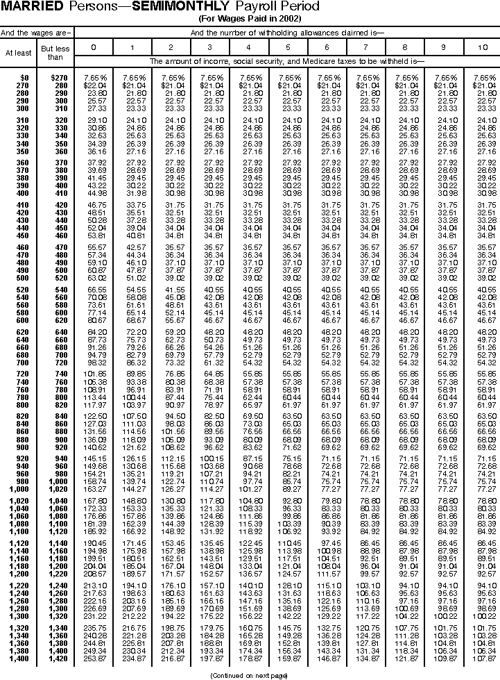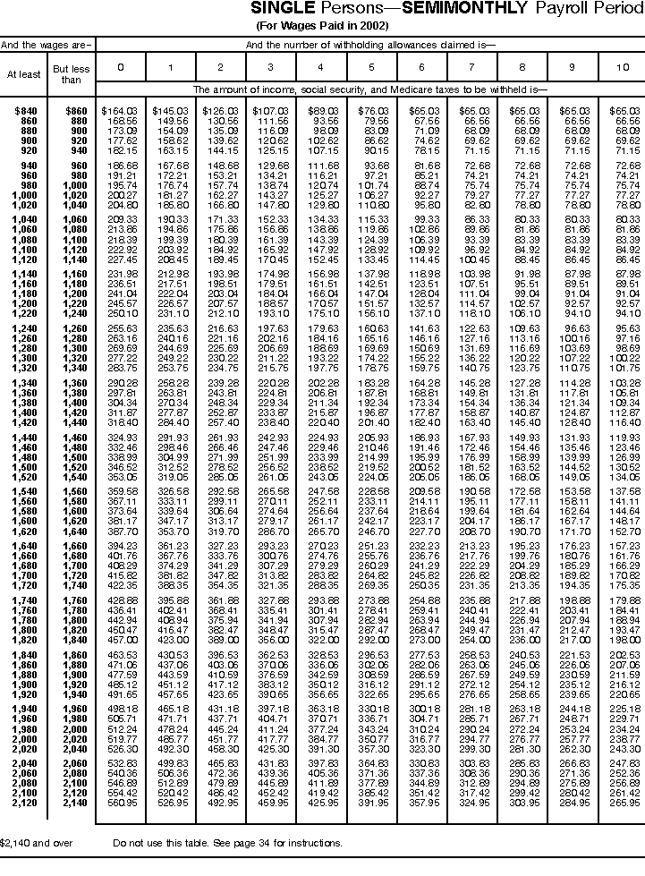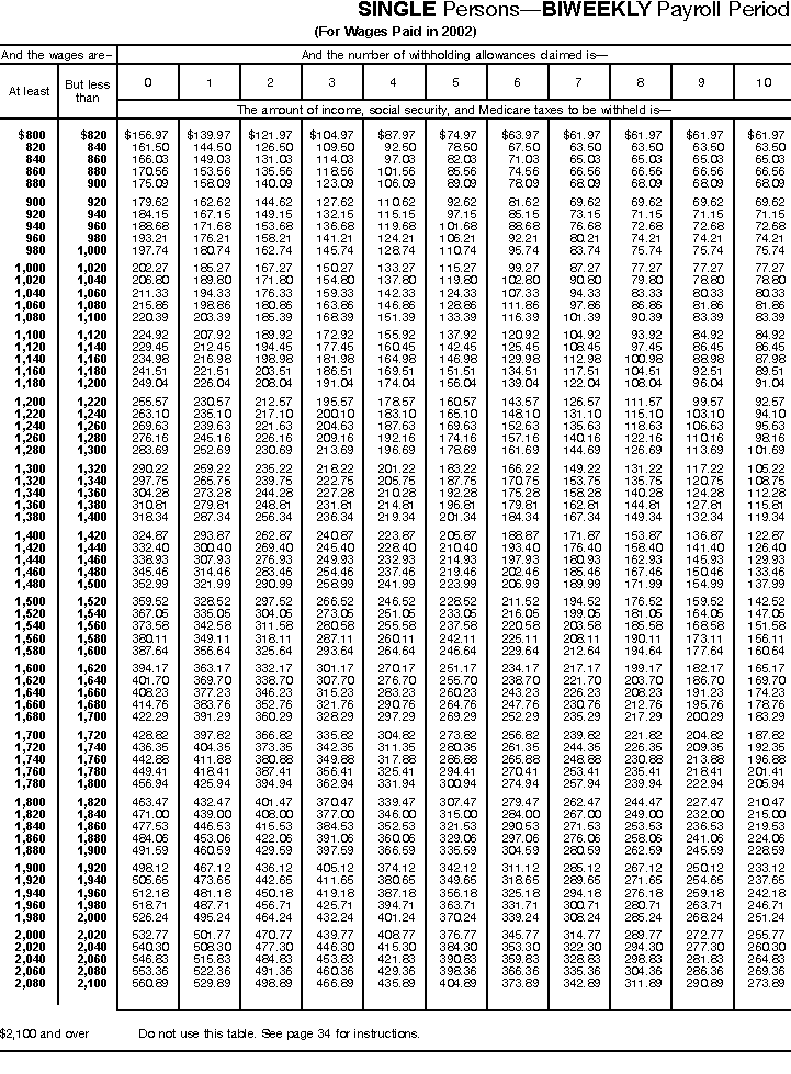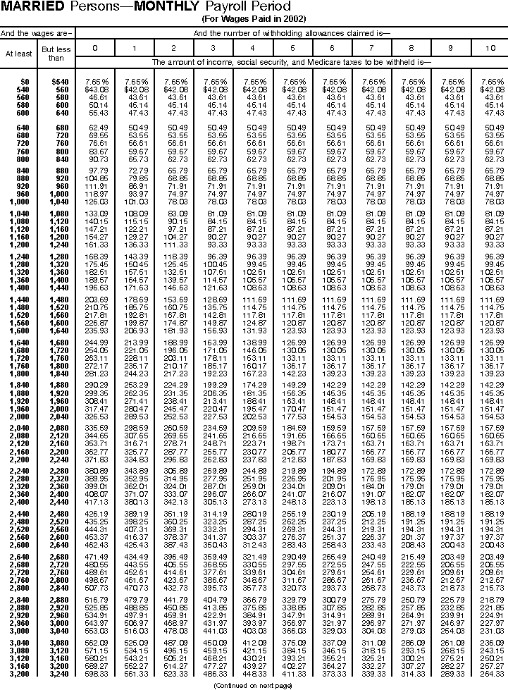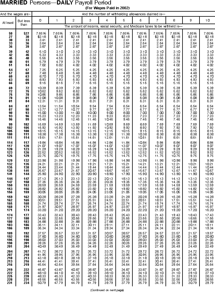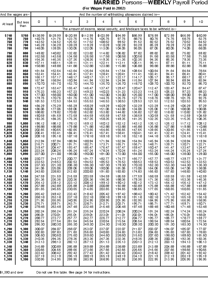 The combined tables give the correct total withholding only if wages for social security and Medicare taxes and income tax withholding are the same. When you have paid more than the maximum amount of wages subject to social security tax ($84,900 in 2002) in a calendar year, you may no longer use the combined tables.