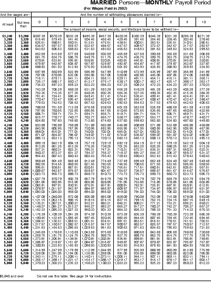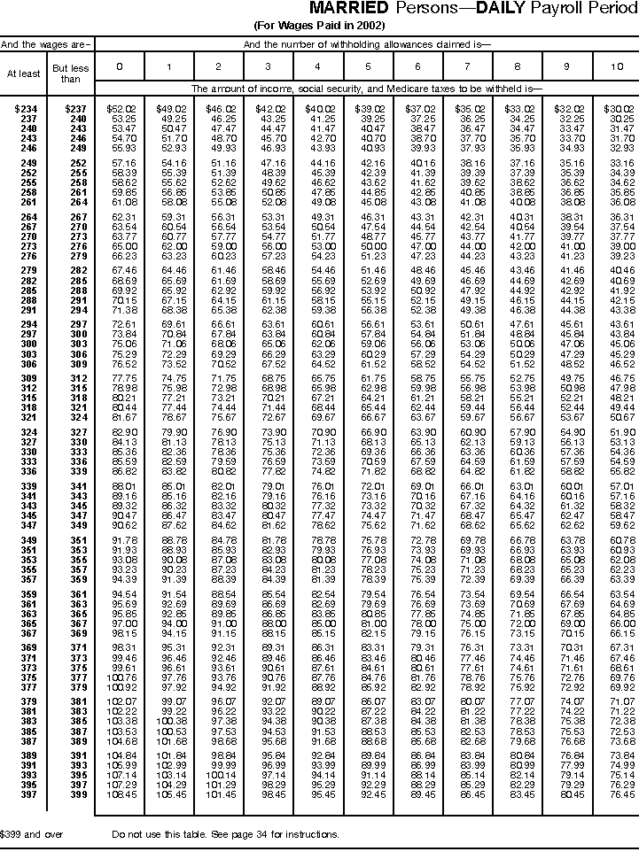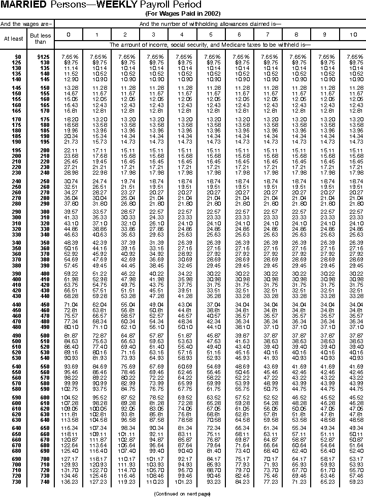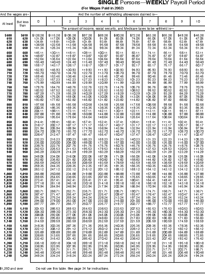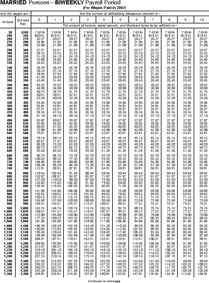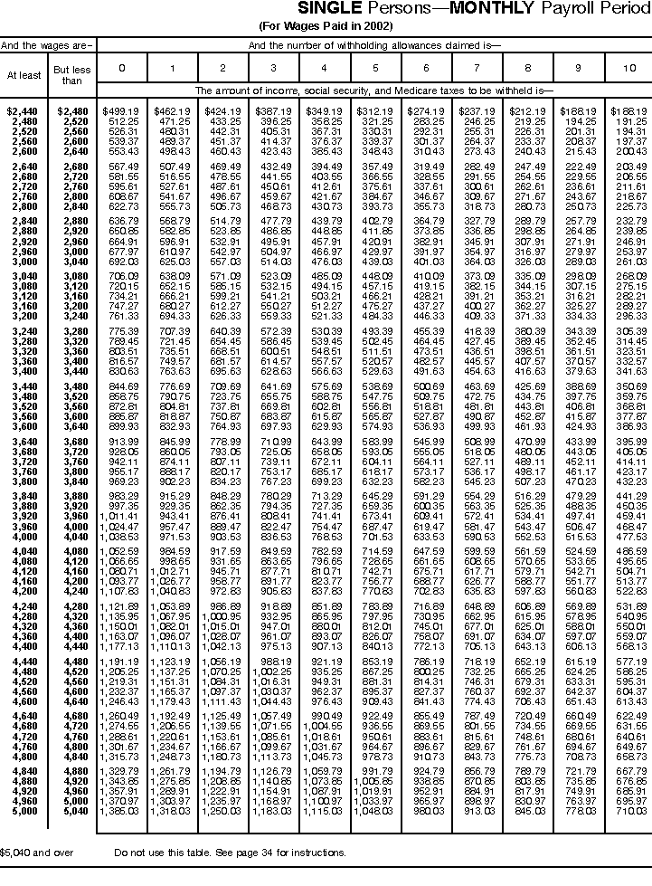 The combined tables give the correct total withholding only if wages for social security and Medicare taxes and income tax withholding are the same. When you have paid more than the maximum amount of wages subject to social security tax ($84,900 in 2002) in a calendar year, you may no longer use the combined tables.