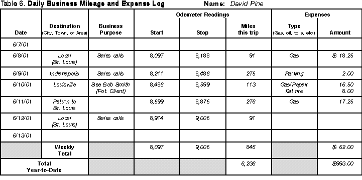 from David's logbook is illustrated in Table 6. He records his business mileage (but not his personal miles) and expenses daily.