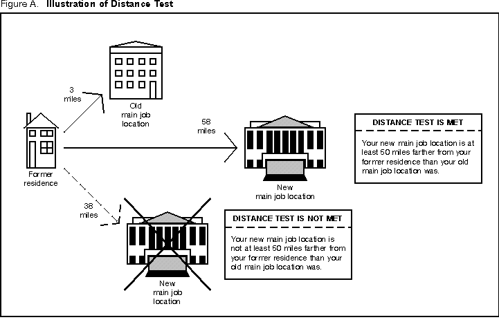 The distance between a job location and your home is the shortest of the more commonly traveled routes between them. The distance test considers only the location of your former home. It does not take into account the location of your new home. See Figure A.