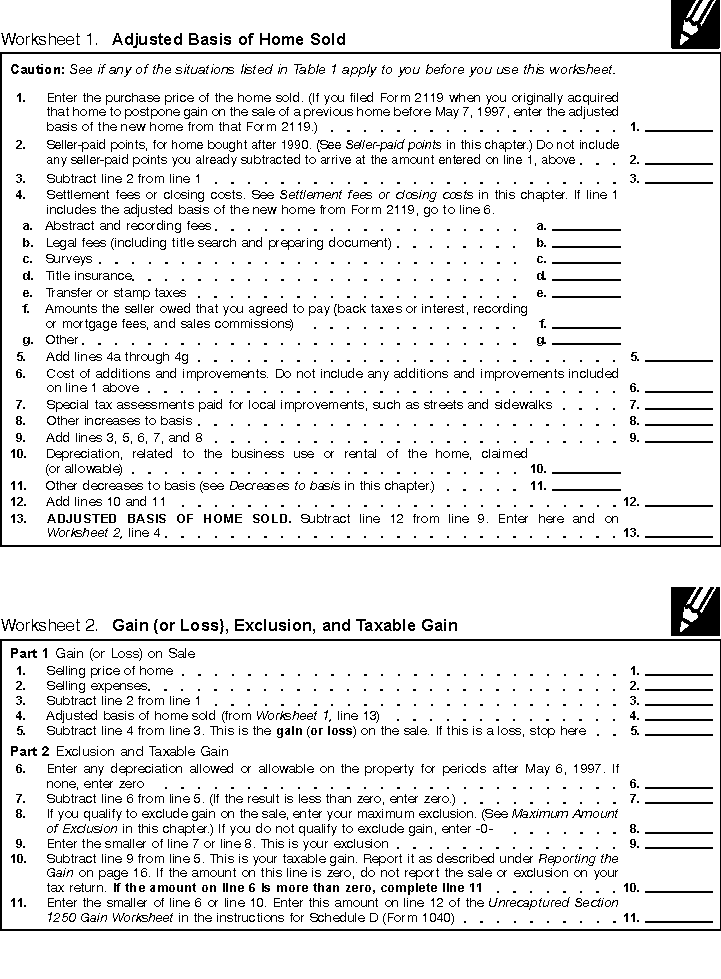 Worksheet 1. Adjusted Basis of Home Sold and Worksheet 2. Gain (or Loss), Exclusion and Taxable Gain