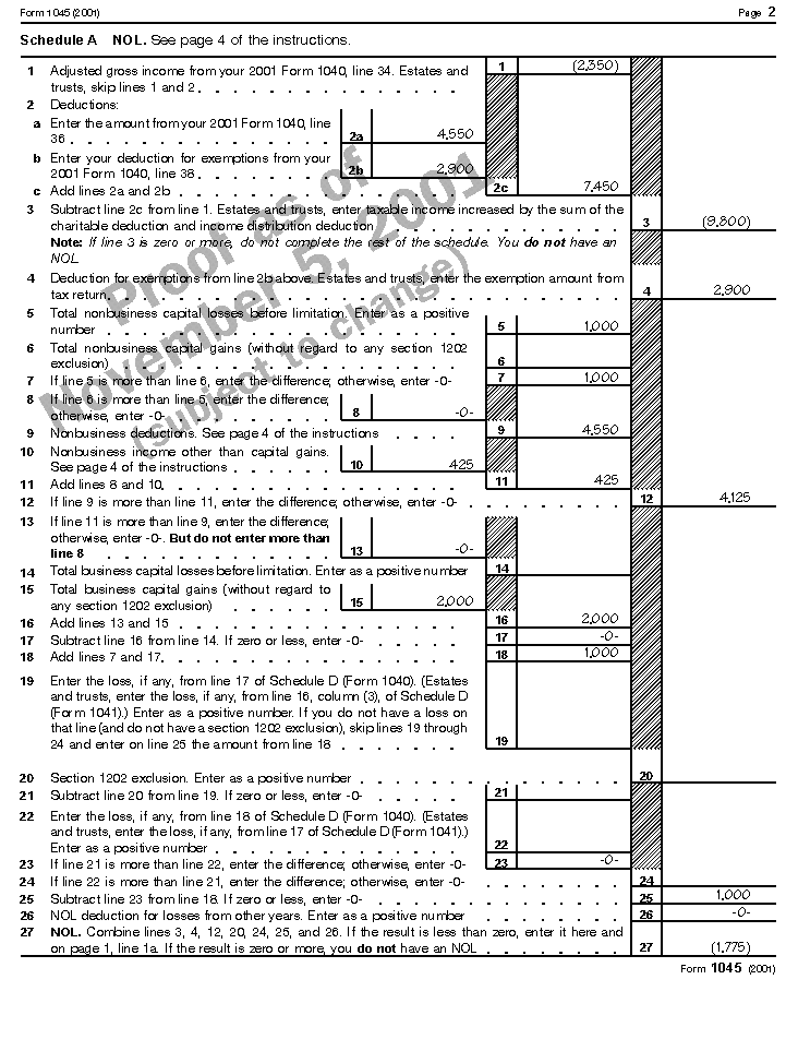 The following example illustrates how to figure an NOL. It includes filled-in pages 1 and 2 of Form 1040 and Schedule A (Form 1045).
