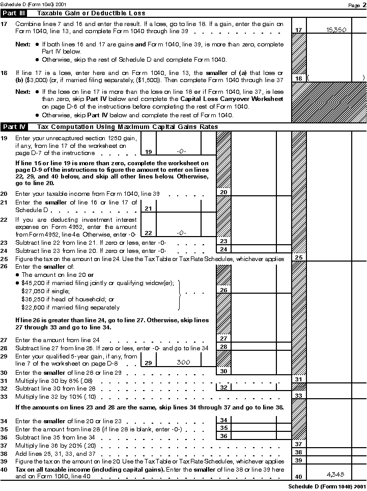 Emily Jones is single and, in addition to wages from her job, she has income from stocks and other securities. For the 2001 tax year, she had the following capital gains and losses, which she reports on Schedule D. Her filled-in Schedule D is shown at the end of this example.