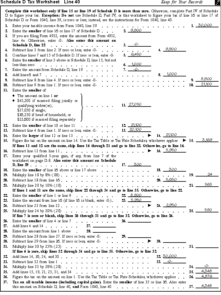 After entering the gain from line 17 on line 13 of her Form 1040, she completes the rest of Form 1040 through line 39. She enters the amount from that line, $30,000, on line 1 of the Schedule D Tax Worksheet. After filling out the rest of that worksheet, she figures her tax is $4,348. This is less than the tax she would have figured without the capital gain tax rates, $4,876.