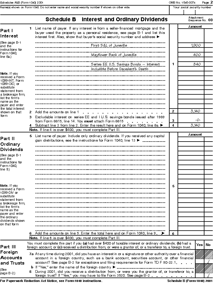 In addition to the amount you received from your father's employer for unpaid salary and for vacation pay ($12,000) entered on line 8 (Form 1041), you received a dividend check from the XYZ Company on June 16, 2001. The check was for $750 and you enter it on line 2 (Form 1041). The estate received a Form 1099-INT showing $2,250 interest paid by the bank on the savings account in 2001 after your father died. Show this amount on line 1 (Form 1041).