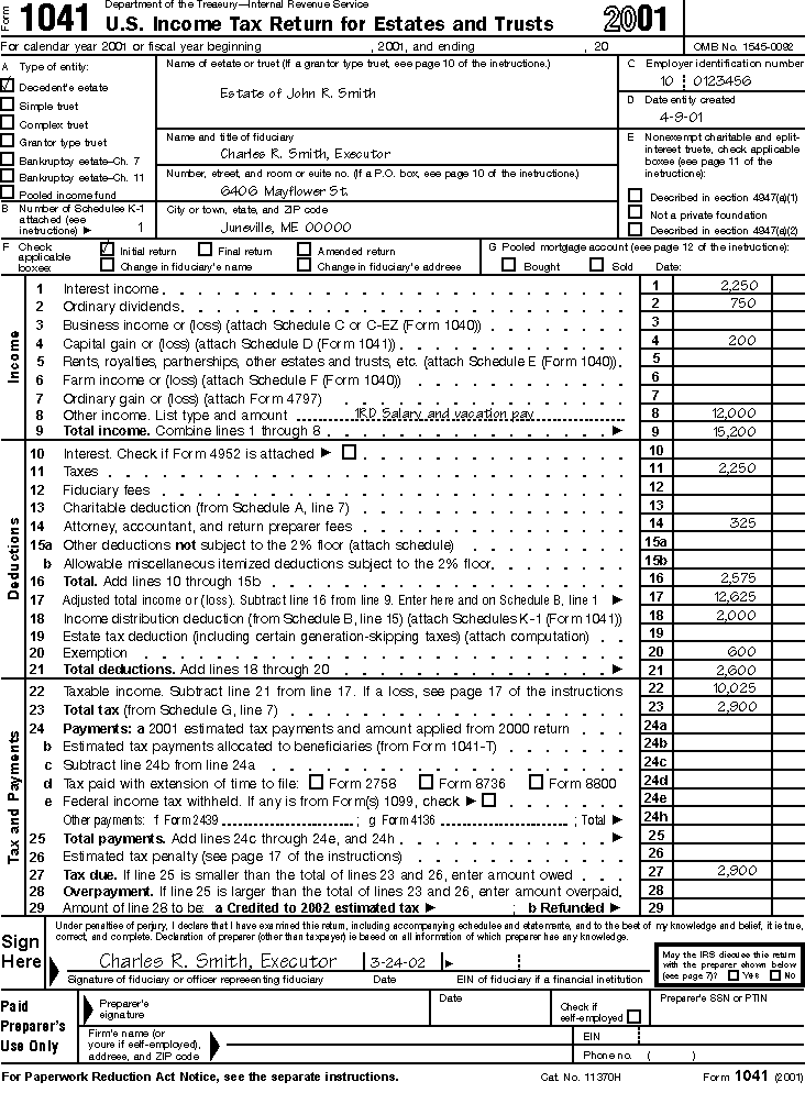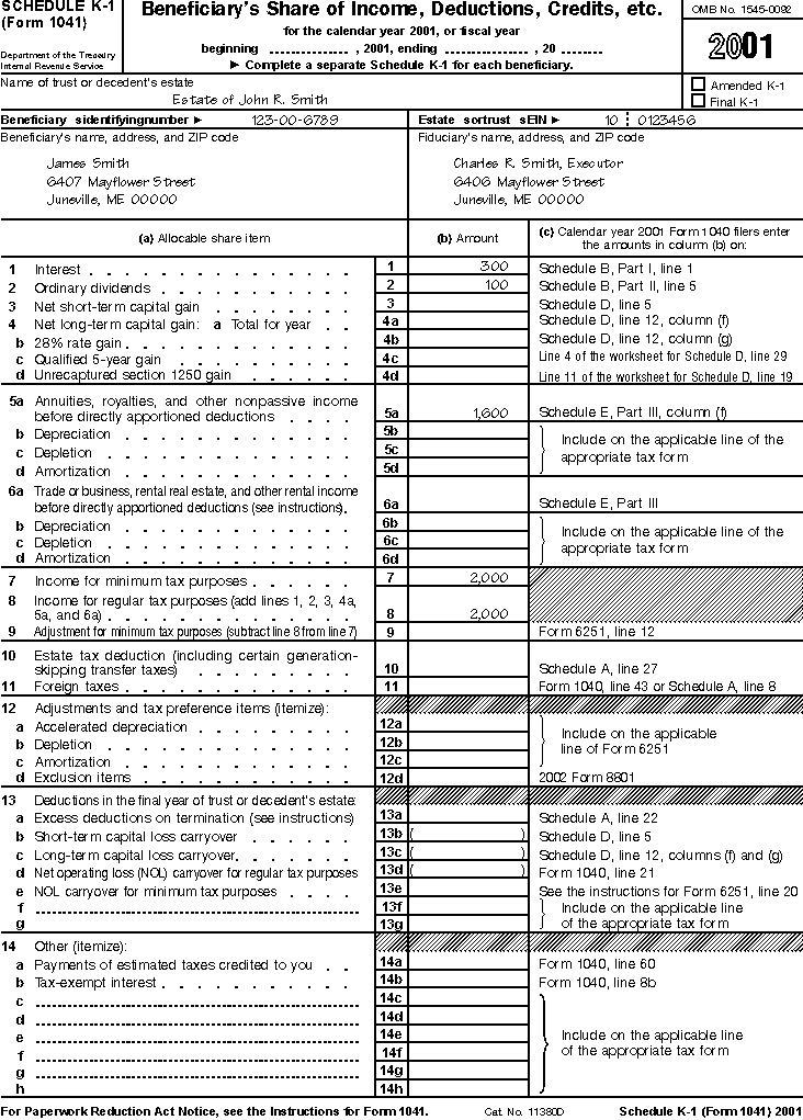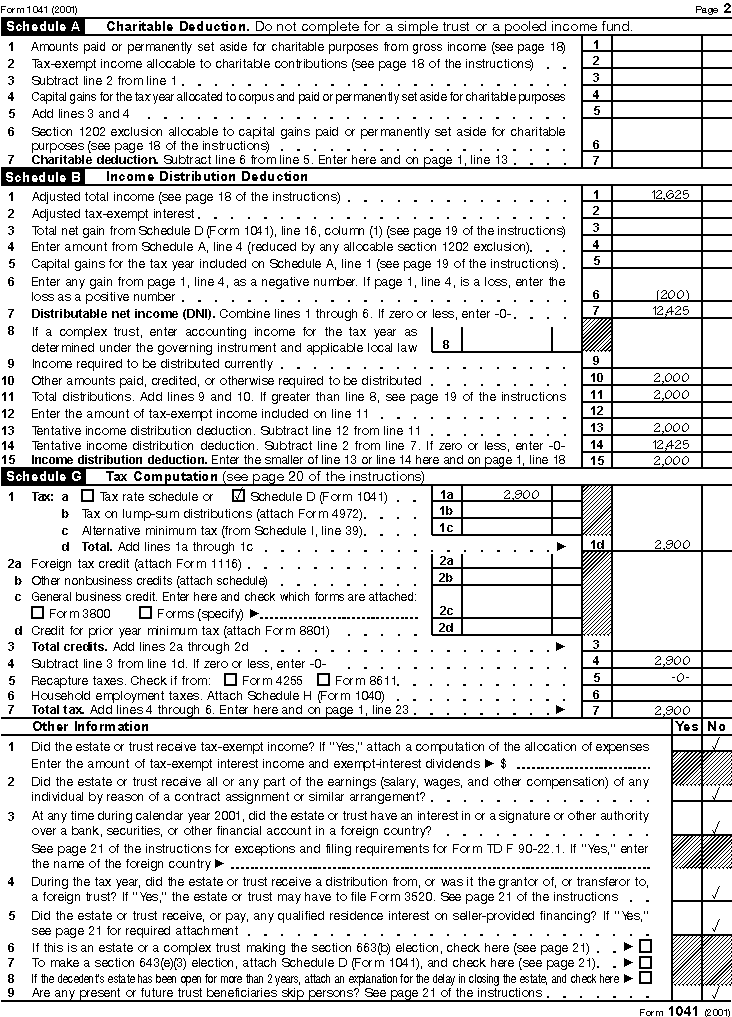 The illustrations of Form 1041 and the related schedules for 2001 appear near the end of this publication. These illustrations are based on the information that follows.