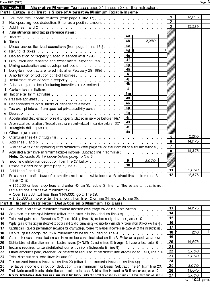 The estate took an income distribution deduction, so you must prepare Schedule I (Form 1041), Alternative Minimum Tax, regardless of whether the estate is liable for the alternative minimum tax.