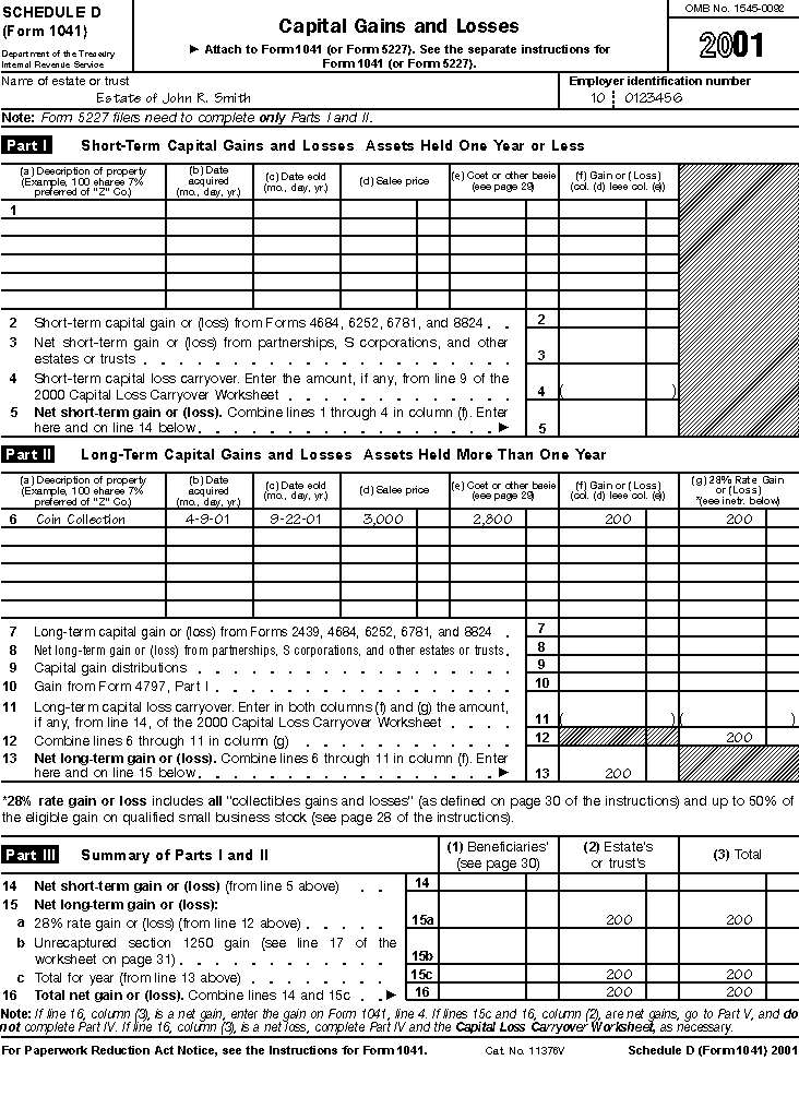 The estate has a gain from the sale of the collection. You will have to report the sale on Schedule D (Form 1041) when you file the income tax return of the estate. The estate has a capital gain of $200 from the sale of the coins. The gain is the excess of the sale price, $3,000, over the value of the collection at the date of your father's death, $2,800. See Gain (or loss) from sale of property under Income Tax Return of an Estate-Form 1041 and its discussion, Income To Include, earlier.