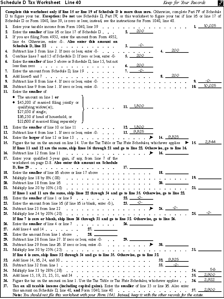 Since the estate had a net capital gain and taxable income, you use Part V of Schedule D (Form 1041) and the Schedule D Worksheet to figure the tax, $2,900, for 2001.