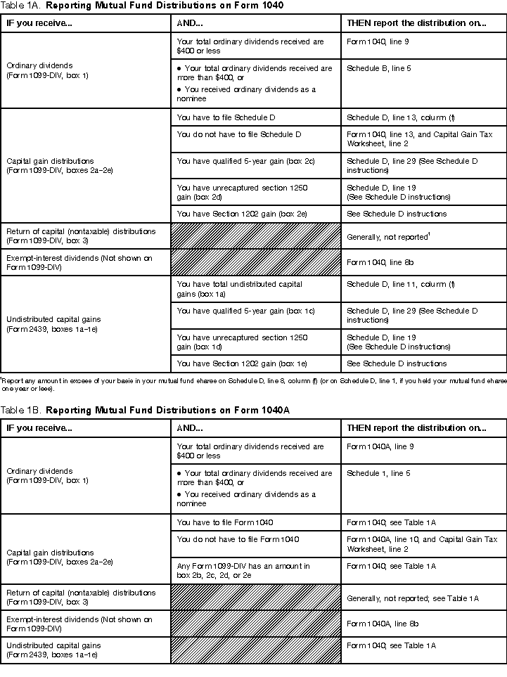 See Tables 1A and 1B for more information on where to report your mutual fund distributions on Form 1040 or Form 1040A.
