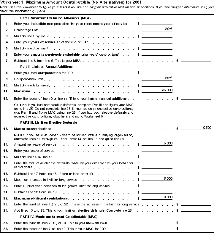 • Worksheet 1. Maximum Amount Contributable (No Alternatives) for 2001.