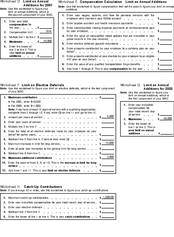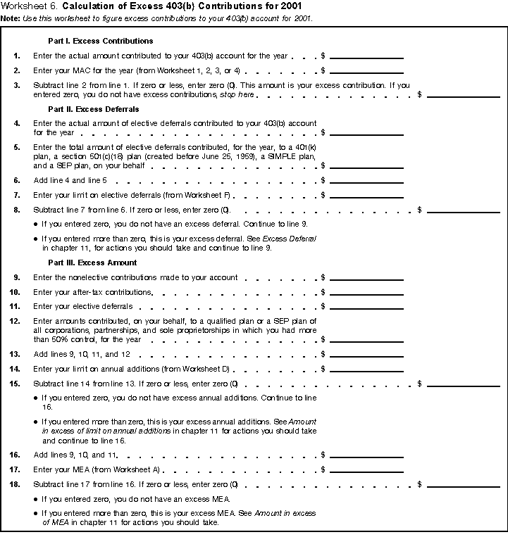 • Worksheet 6. Calculation of Excess 403(b) Contributions for 2001.