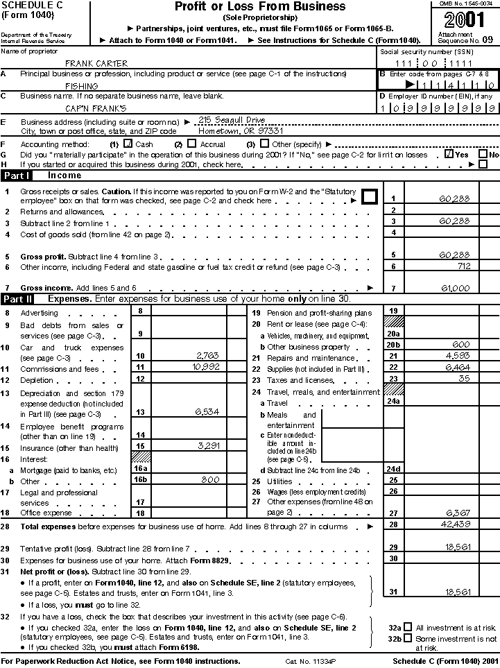 income from fishing, $61,000 (line 7). Frank has a tentative profit of