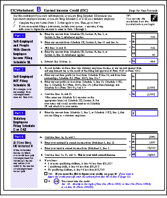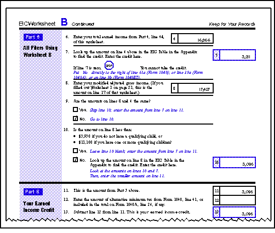 Because the Browns have self-employment income and want to figure their credit themselves, they complete EIC Worksheet B (shown later).