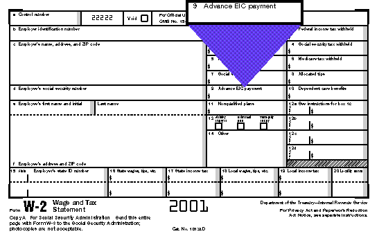 If you received advance payments of EIC in 2001, you must file Form 1040 or Form 1040A to report the payments. Your Form W-2, box 9, (as