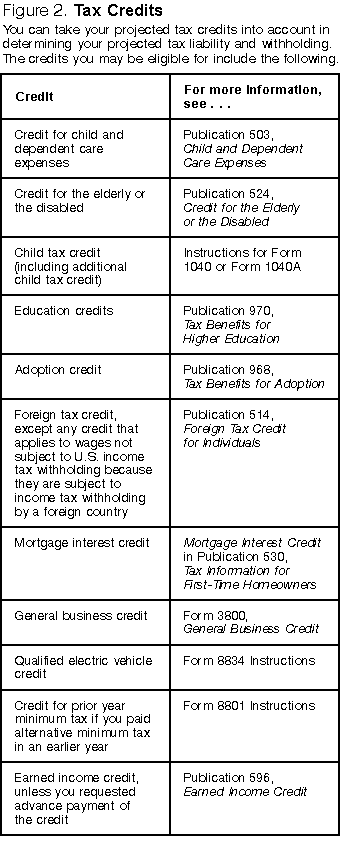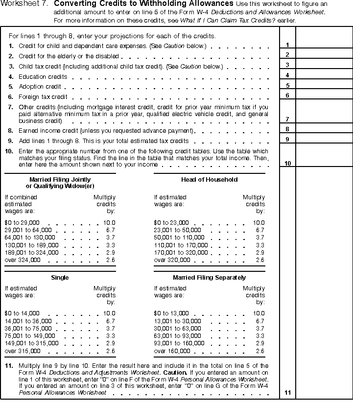 What if I can claim tax credits? Figure 2 shows tax credits you may be able to use to reduce your withholding. The Form W-4 Personal Allowances Worksheet only provides rough adjustments for the child and dependent care credit (line F) and the child tax credit (line G). Use Worksheet 7 to take these credits into account more accurately and also take other credits into account.