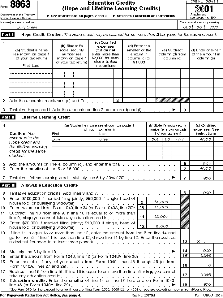 income is $22,000. Her tax is $2,246. In July 2001 she pays $700 for the summer 2001 semester; in August 2001 she pays $1,900 for the fall 2001