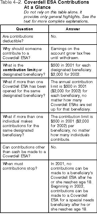 Limit for each designated beneficiary. The total of all contributions to all Coverdell ESAs set up for the benefit of any one designated beneficiary cannot be more than $500 in 2001 ($2,000 for 2002). This includes contributions (other than rollovers) to all the beneficiary's Coverdell ESAs from all sources. Rollovers are discussed under Rollovers and Other Transfers, later.