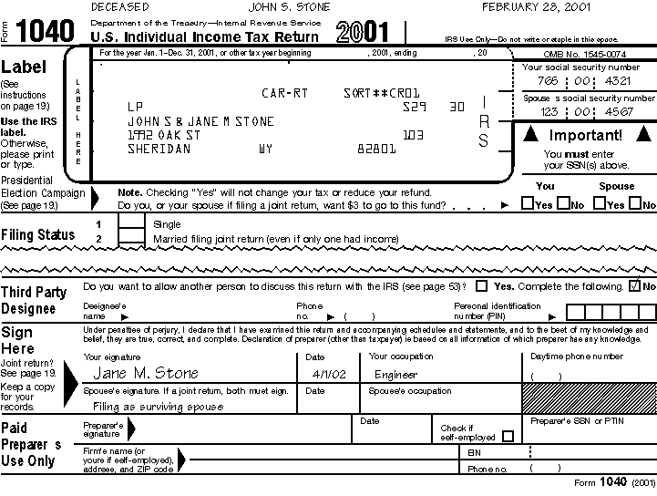 John Stone died in early 2001. He was survived by his wife Jane. The top of their final joint return on Form 1040, which includes the required